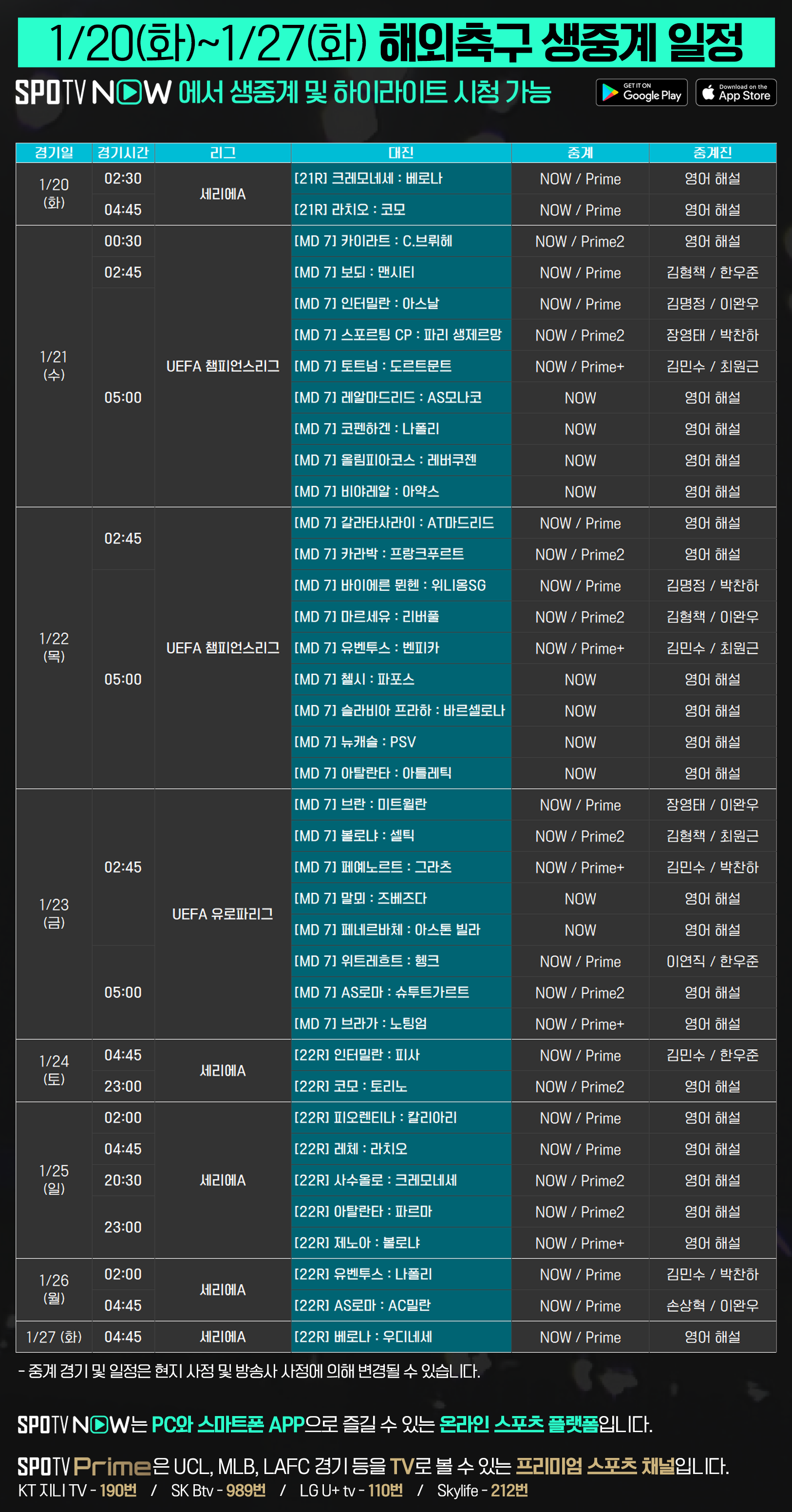 1/20(화) ~ 1/27(화) 해외축구 생중계 안내2026-01-19