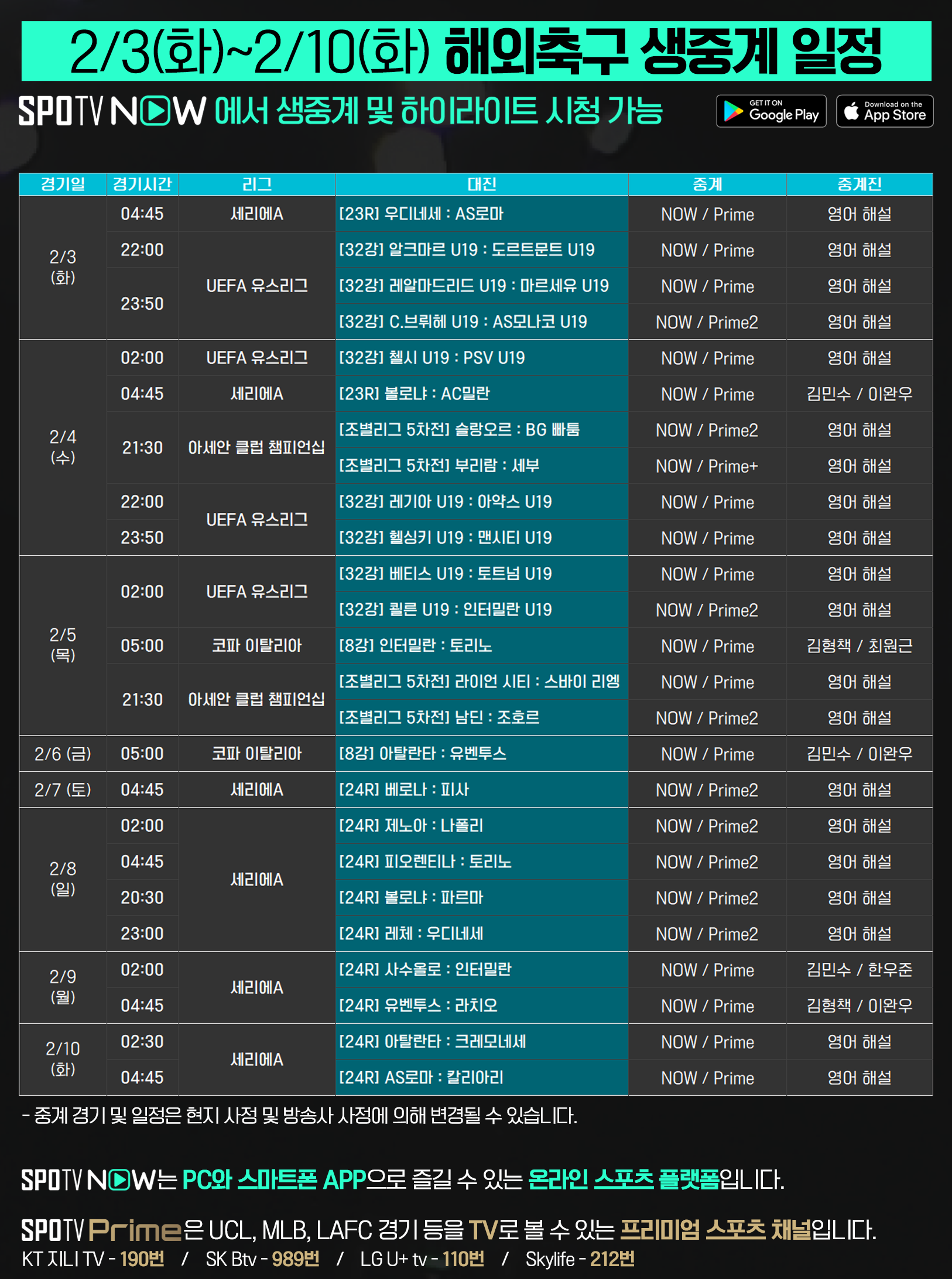 치열한 우승 경쟁이 펼쳐지고 있는 25-26 세리에A와 코파 이탈리아는 물론 유망주들의 활약을 만날 수 있는 UEFA 유스리그 생중계까지 SPOTV NOW와 SPOTV Prime에서 함께해 주세요.