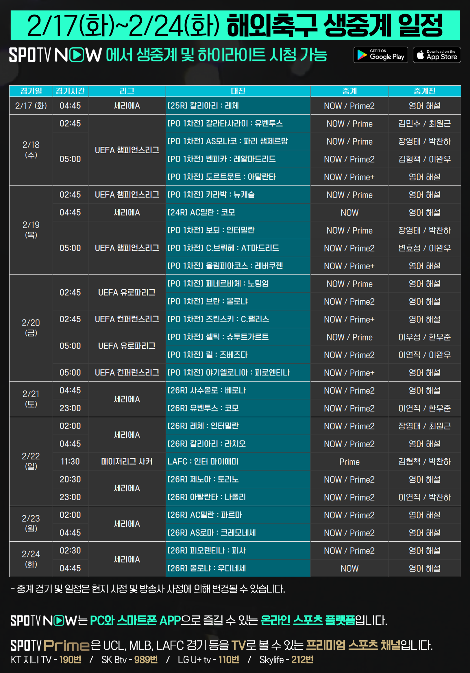 치열한 우승 경쟁이 펼쳐지고 있는 25-26 세리에A와 코파 이탈리아 생중계는 SPOTV NOW와 SPOTV Prime에서 함께해 주세요.