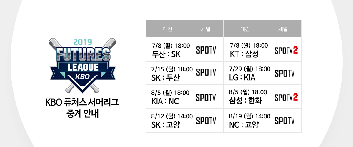 SPOTV가 오는 8일 월요일부터 2019 KBO 퓨처스 서머리그 주요 경기를 중계합니다. 자세한 중계 채널 및 일정 참고하시고 월요일 밤도 야구와 함께 하세요!