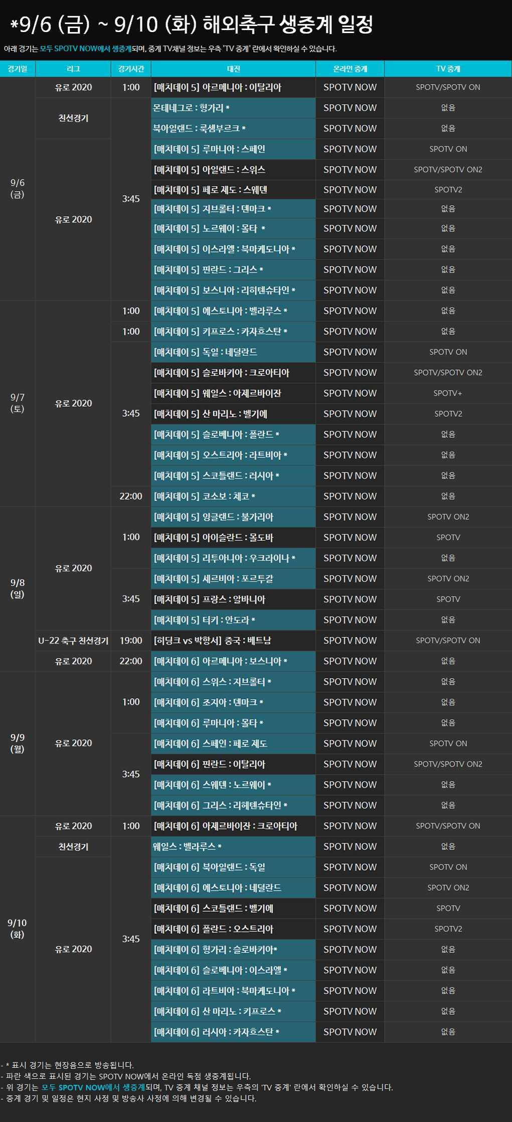 9/6 (금) - 9/10 (화) 해외축구 생중계 일정 안내2019-09-03