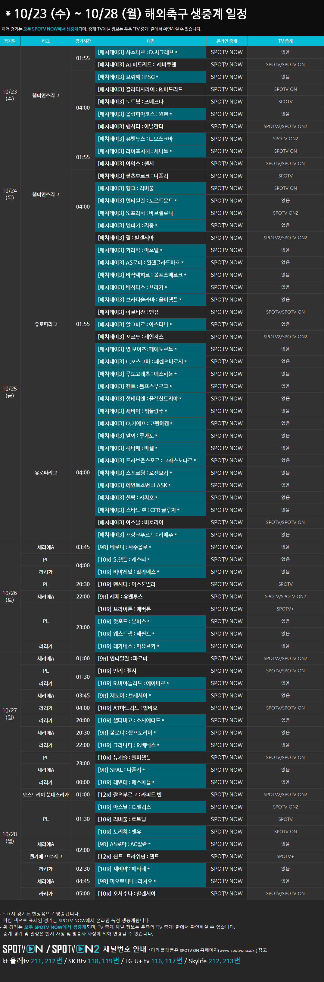 10/23 (수) ~ 10/28 (월) 해외축구 생중계 일정 안내2019-10-22