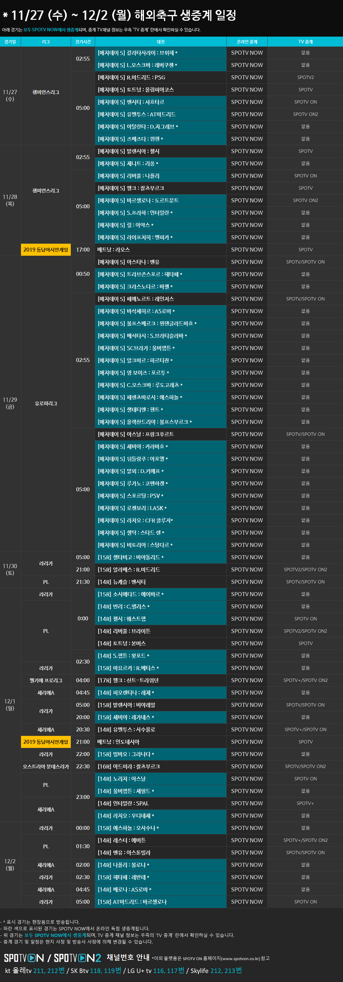 11/27 (수) ~ 12/2 (월) 해외축구 생중계 일정 안내2019-11-26