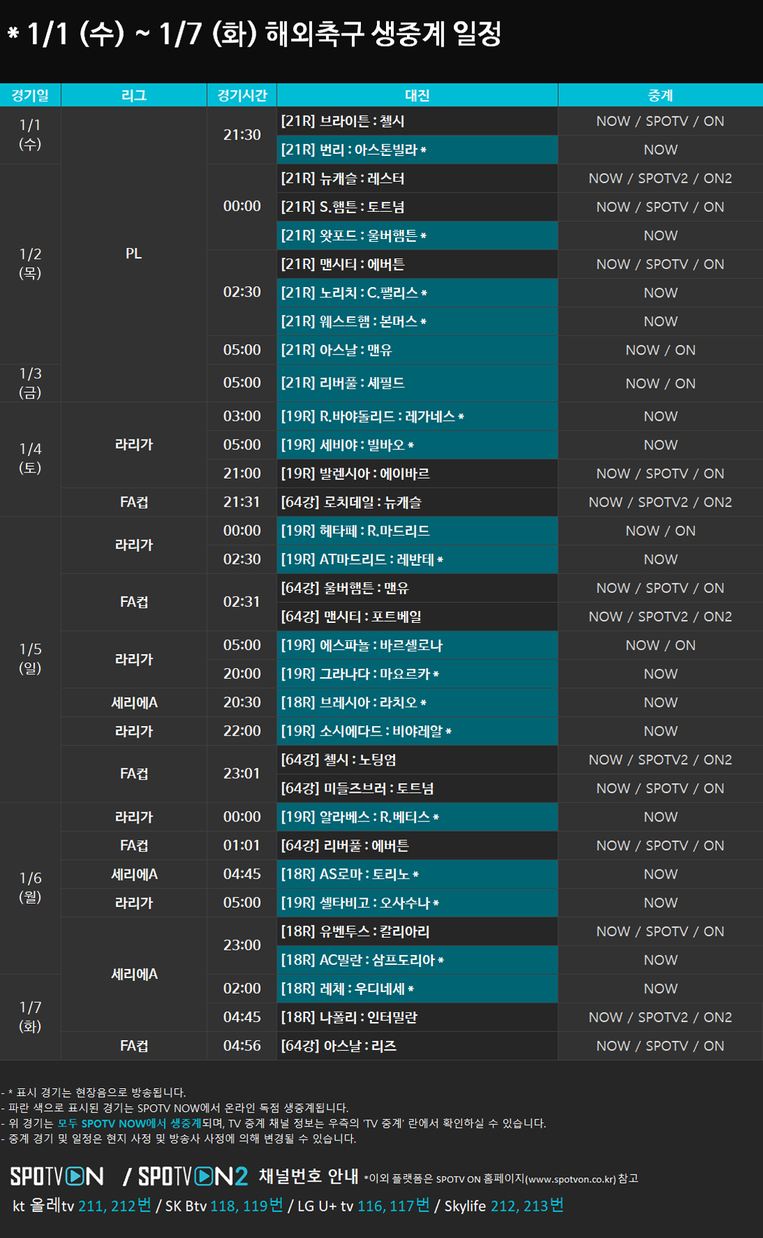 1/1 (수) ~ 1/7 (화) 해외축구 생중계 일정 안내2019-12-30