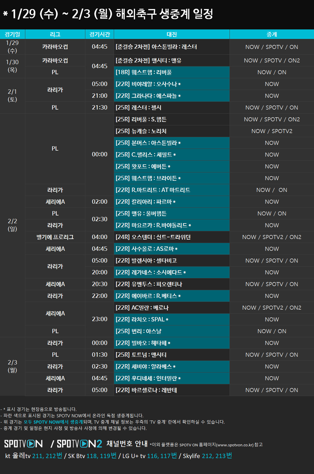 1/29 (수) ~ 2/3 (월) 해외축구 생중계 일정 안내2020-01-28