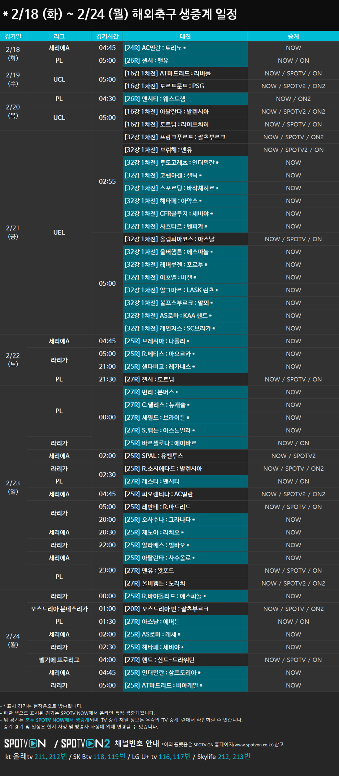 2/18 (화) ~ 2/24 (월) 해외축구 생중계 일정 안내2020-02-17