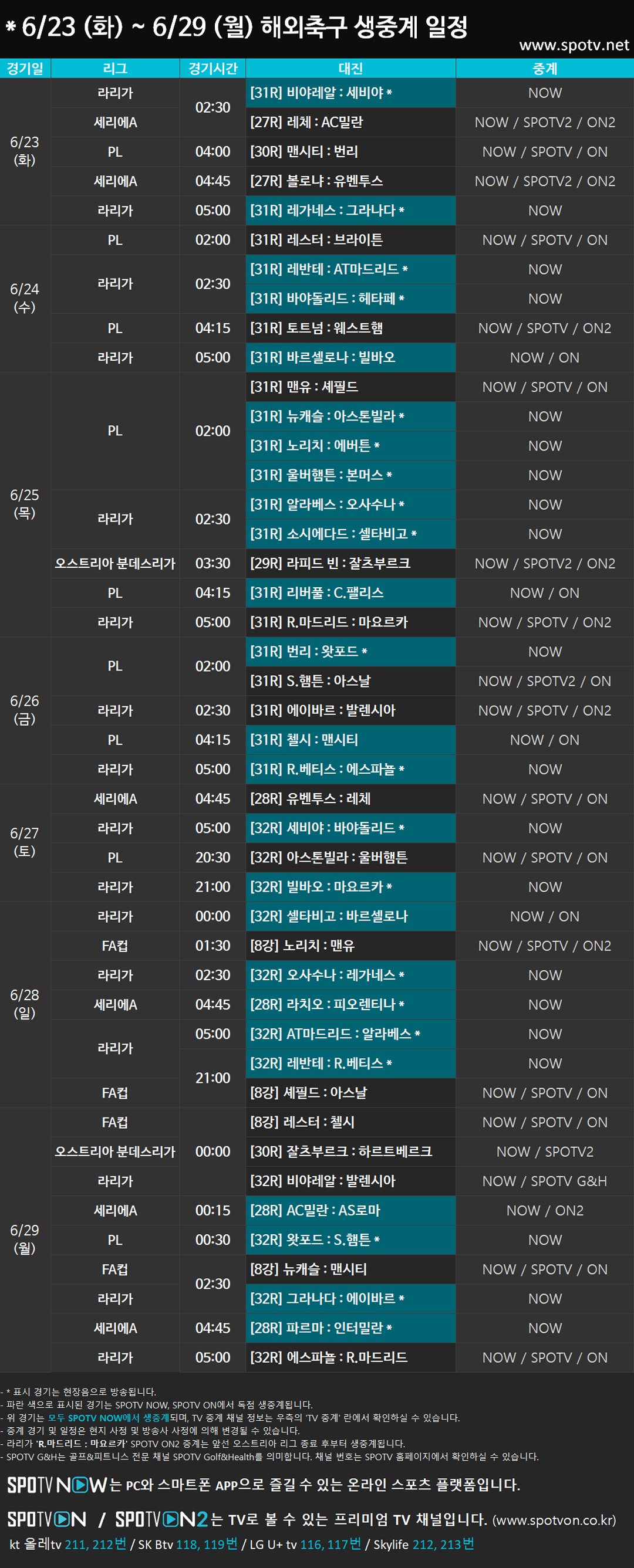 6/23 (화) ~ 6/29 (월) 해외축구 생중계 일정 안내2020-06-22