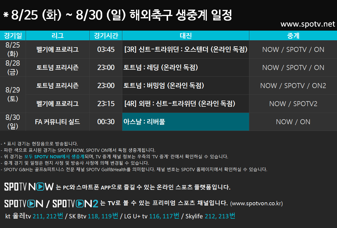 8/25 (화) ~ 8/30 (일) 해외축구 생중계 일정 안내2020-08-24