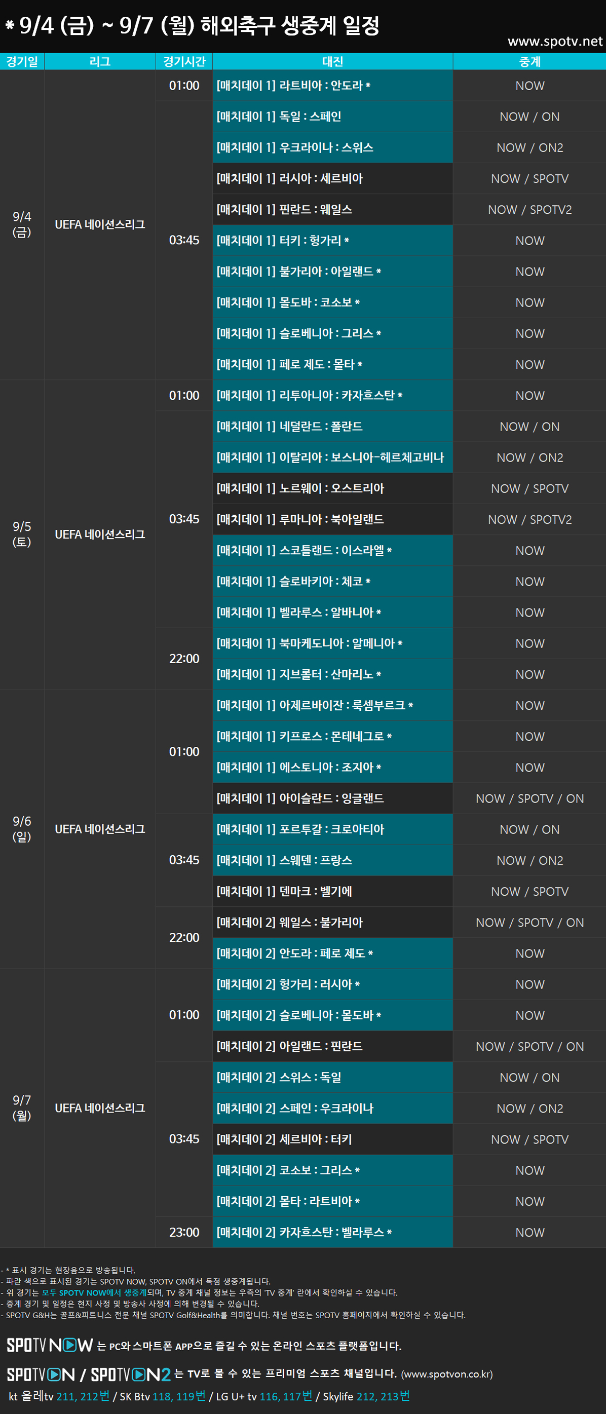 9/4 (금) ~ 9/7 (월) 해외축구 생중계 일정 안내2020-08-31