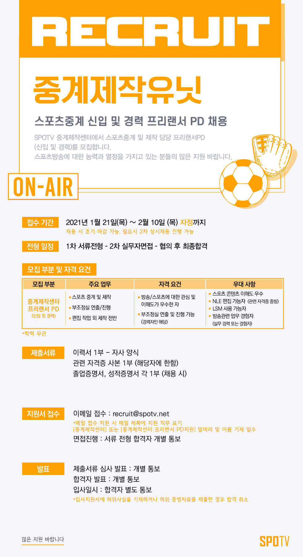 [채용공고] 중계제작유닛 스포츠중계 신입 및 경력 프리랜서 PD 채용(1/21 ~ 2/10)2021-01-20