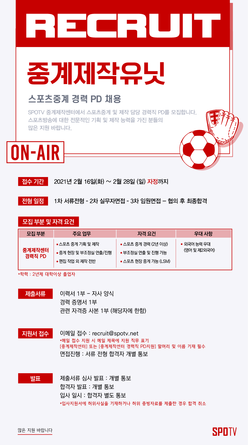 [채용공고] 중계제작유닛 스포츠중계 경력 PD 채용(2/16 ~ 2/28)2021-02-16