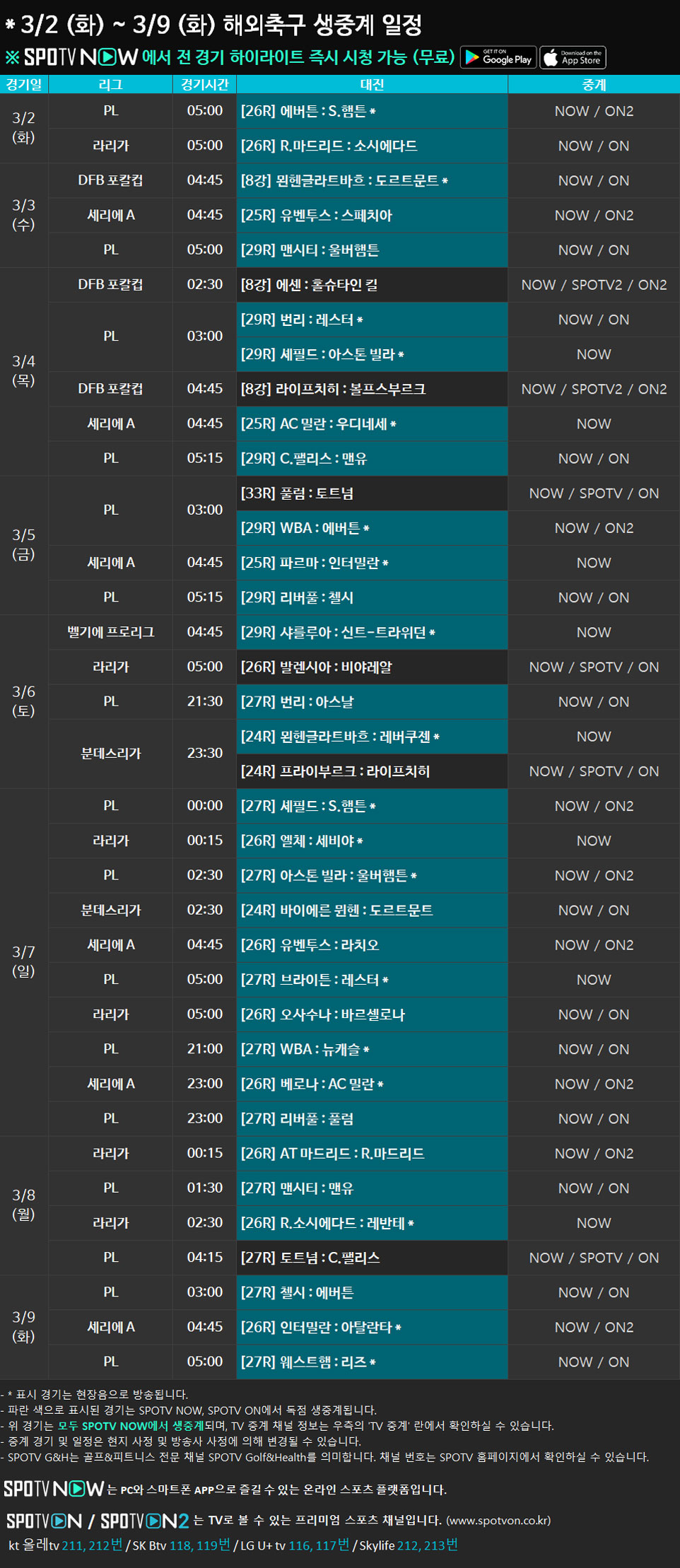 3/2 (화) ~ 3/9 (화) 해외축구 생중계 일정 안내2021-03-02