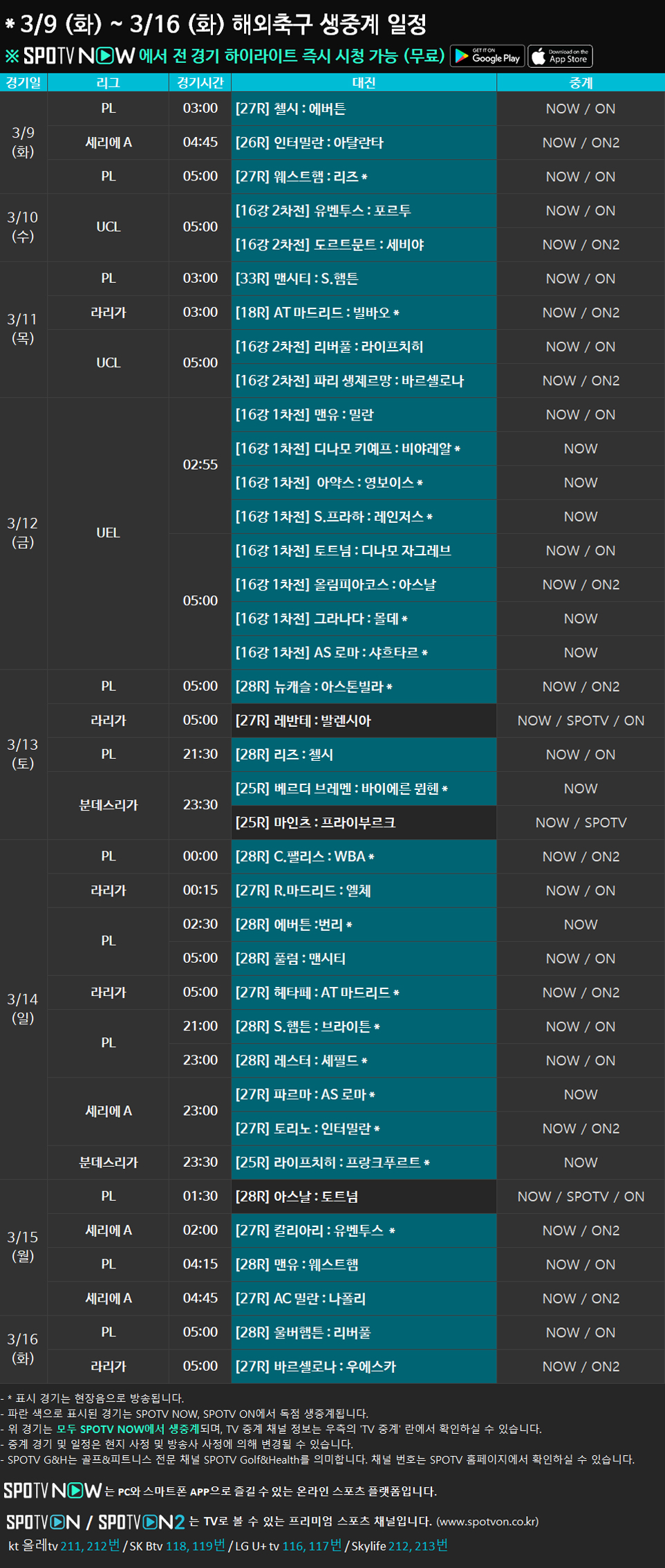 3/9 (화) ~ 3/15 (월) 해외축구 생중계 일정 안내2021-03-08