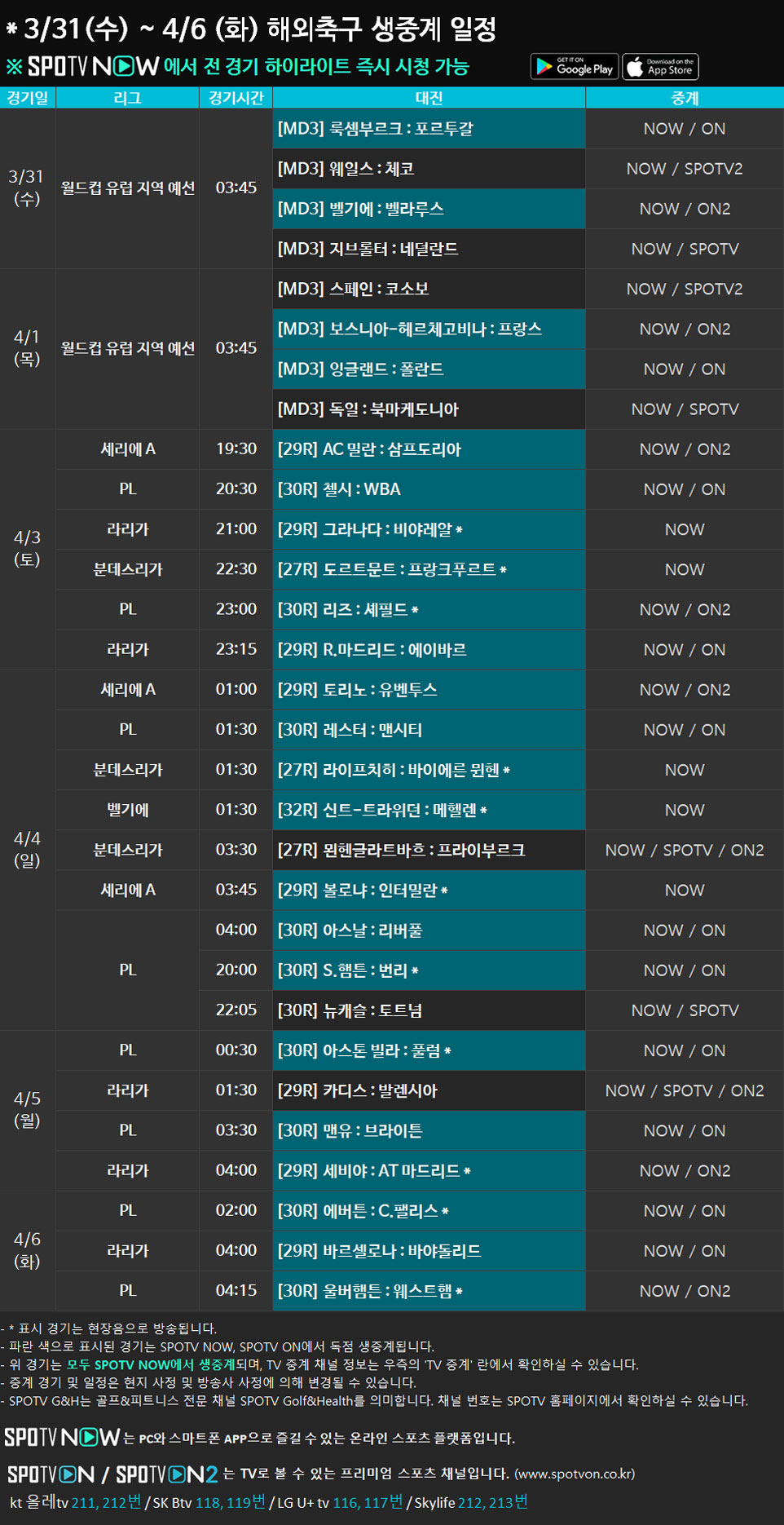 3/31(수) ~ 4/6(화) 해외축구 생중계 일정 안내2021-03-29