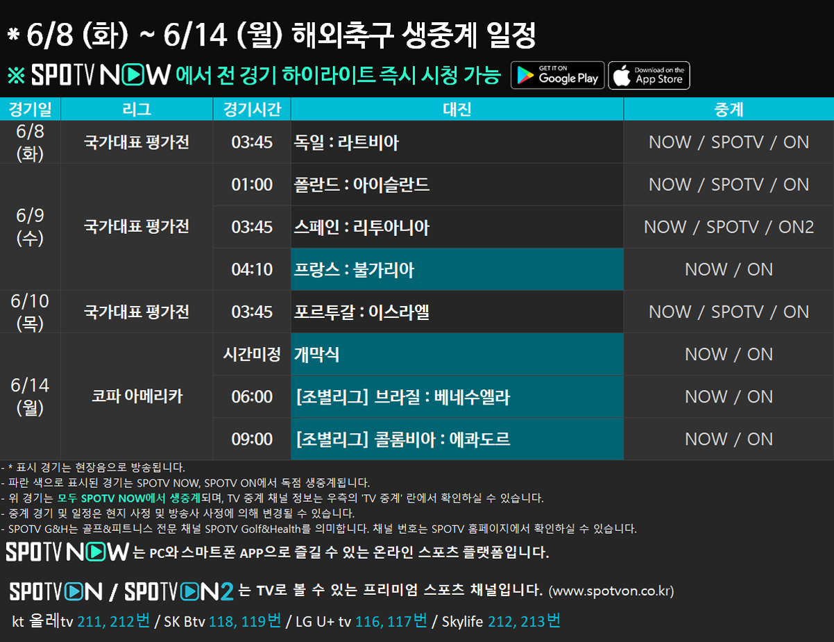 6/8(수) ~ 6/14(월) 해외축구 생중계 일정 및 코파 아메리카 중계 안내2021-06-07