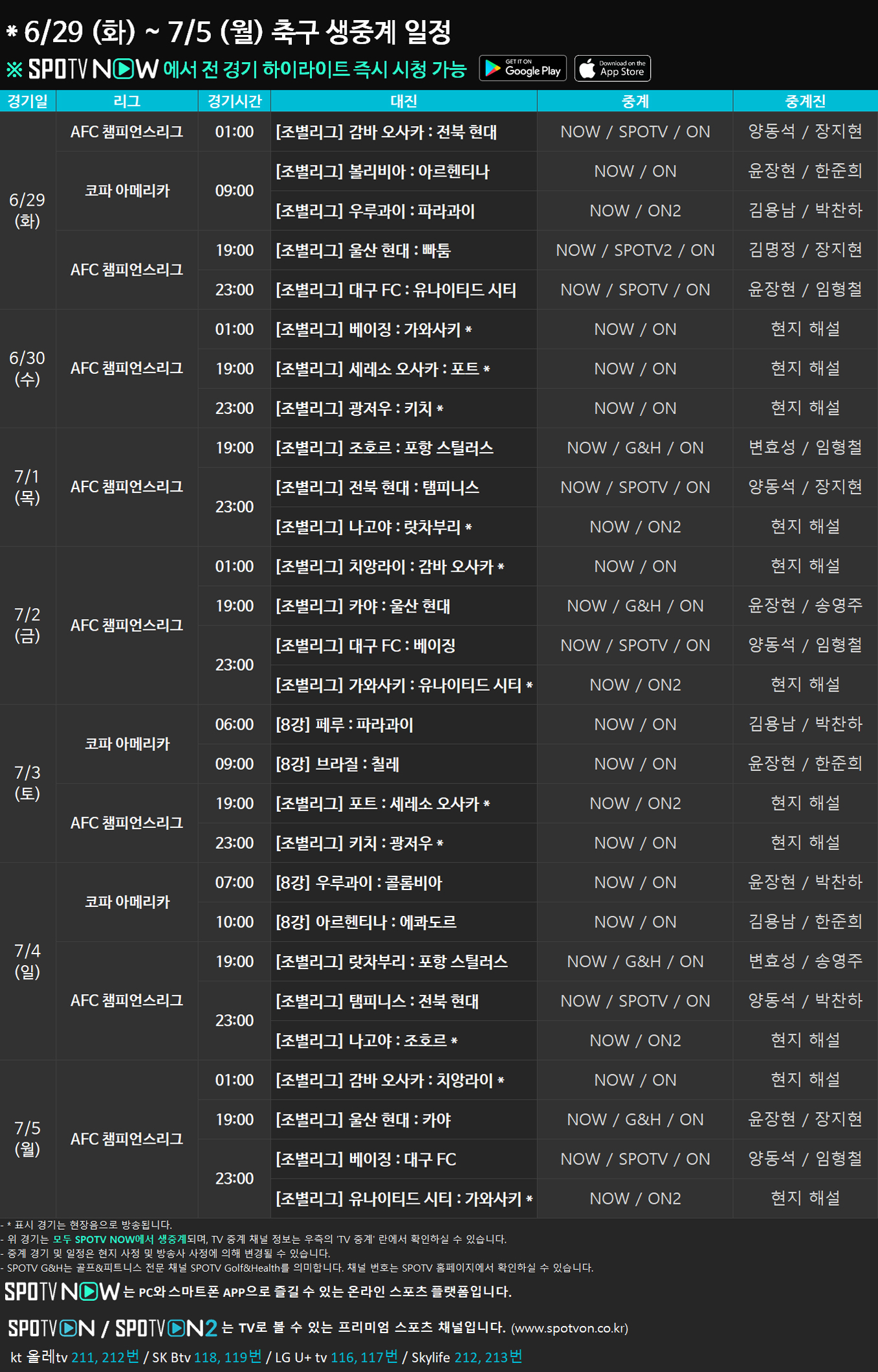 6/29(화) ~ 7/5(월) 2021 코파 아메리카 & ACL 생중계 일정 안내 2021-06-28