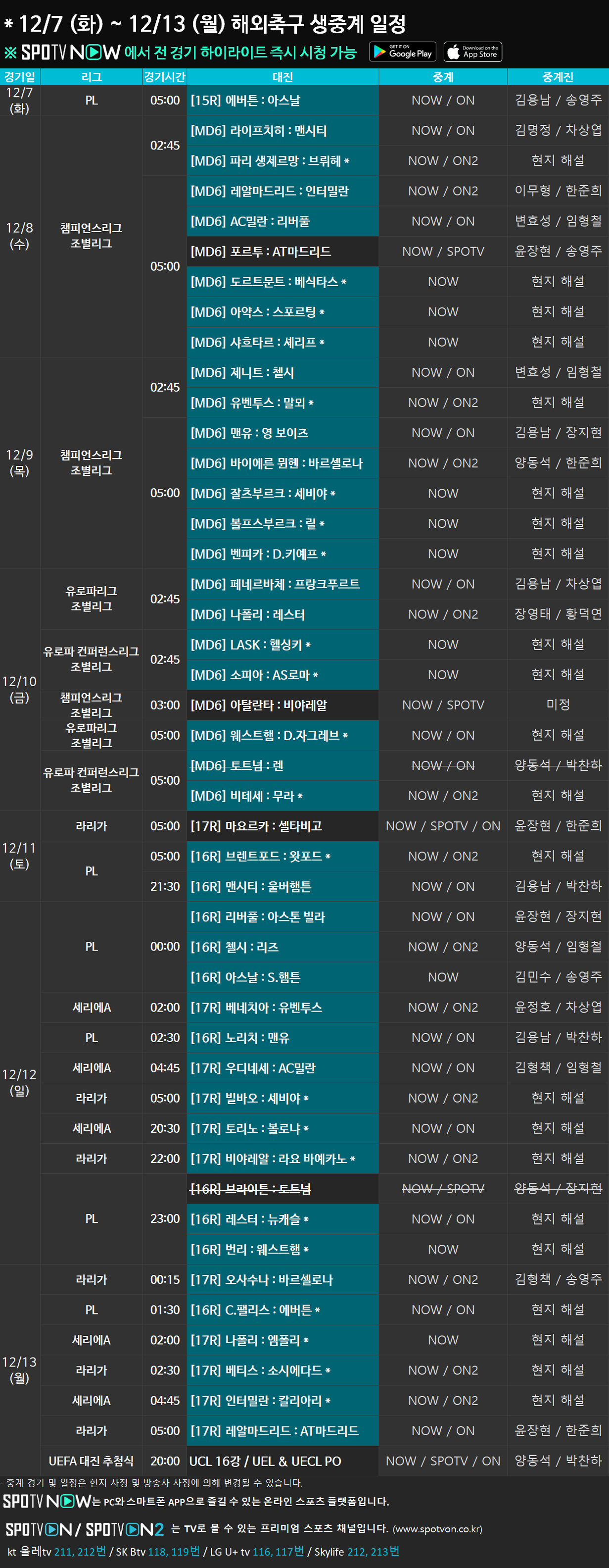 12/7(화) ~ 12/13(월) 해외축구 생중계 일정 안내2021-12-06