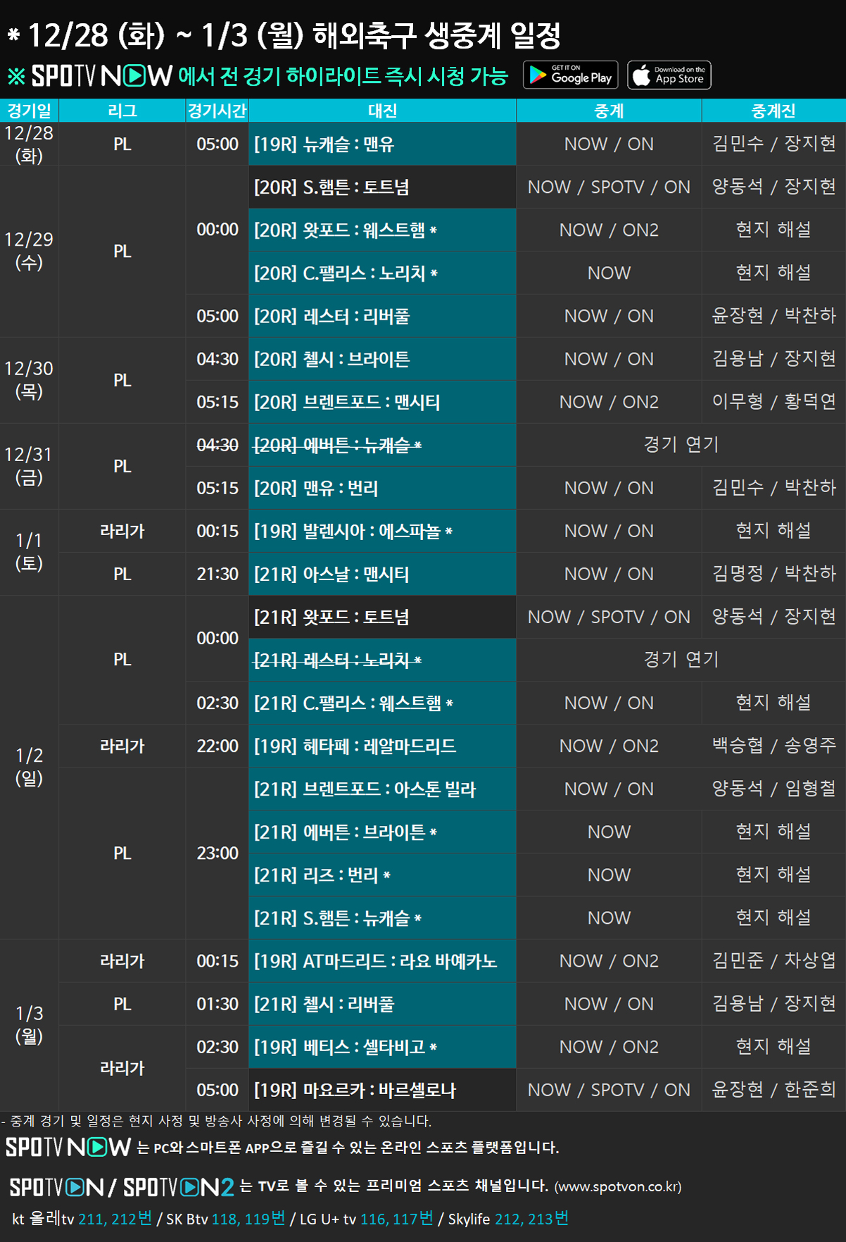 ※ 1/2 (일) 23:00 PL 'S.햄튼 : 뉴캐슬' 경기는 연기되었습니다.