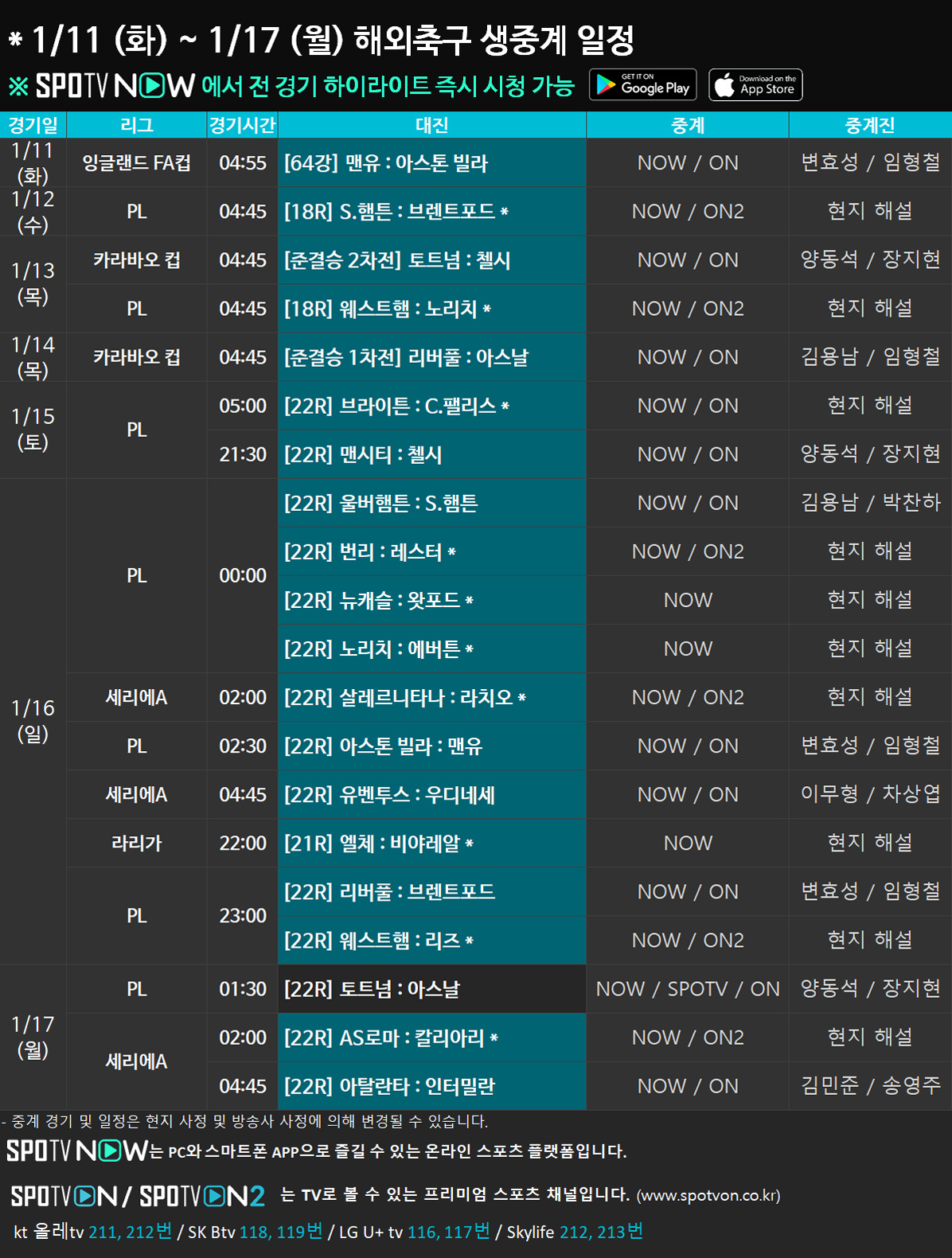 ※ 1/17(월) 01:30 토트넘 : 아스날 경기는 연기되었습니다.