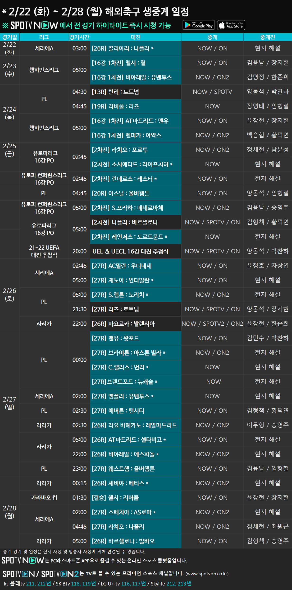 UEFA 챔피언스리그 16강 1차전 전 경기 & 유로파리그, 유로파 컨퍼런스리그 16강 PO 주요 경기 생중계를 SPOTV NOW & SPOTV ON에서 만나 보세요!