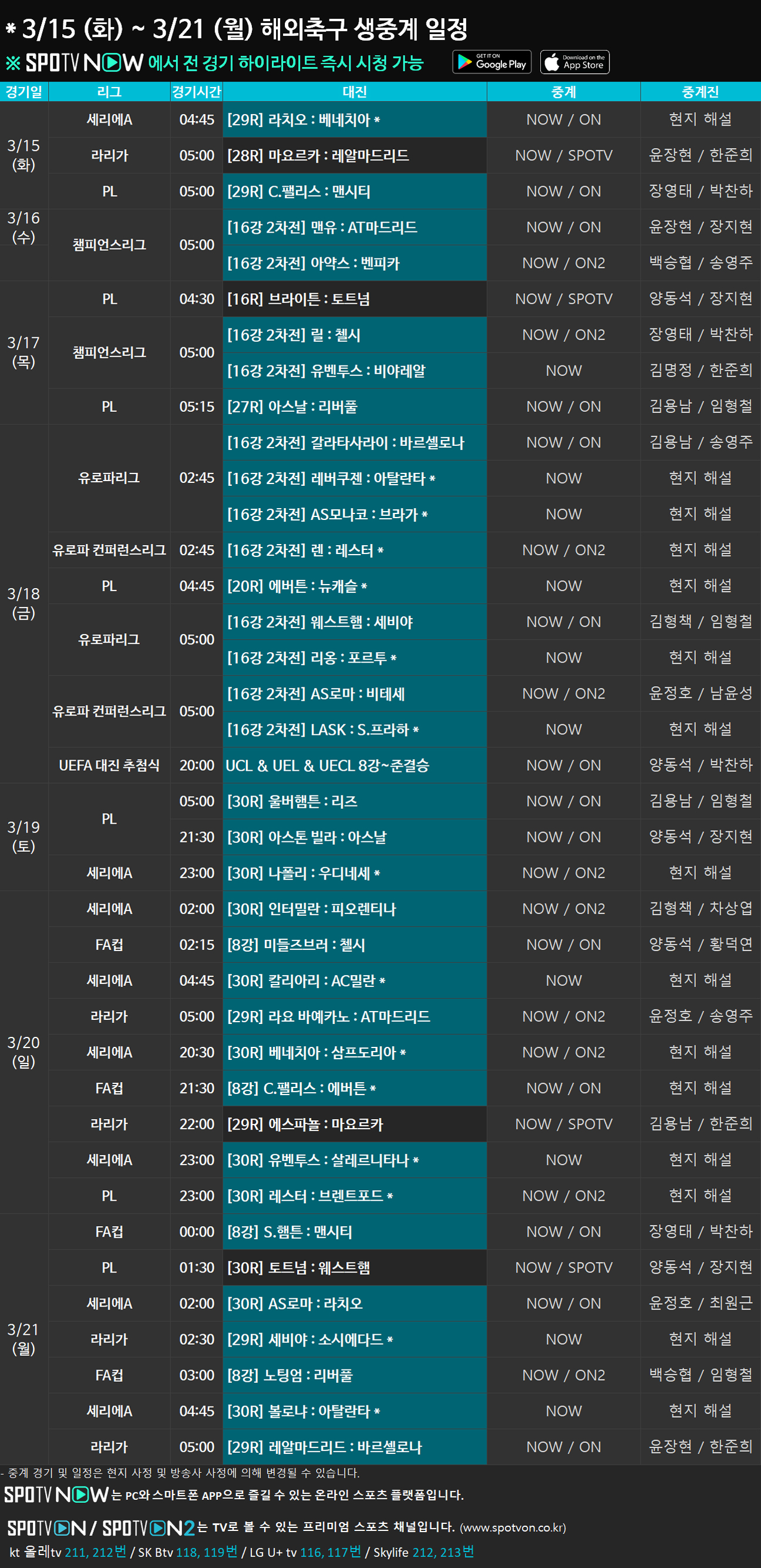 3/21(월) 05:00 예정된 엘 클라시코부터 FA컵 8강 전 경기 생중계까지 SPOTV NOW & SPOTV ON에서 만나 보세요!