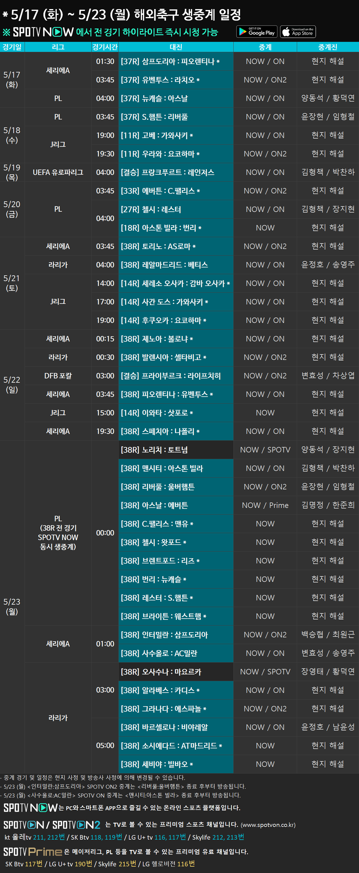 또한, 5/23(월) 00:00 SPOTV NOW에서 21-22 PL 38R 전 경기가 동시 생중계됩니다.