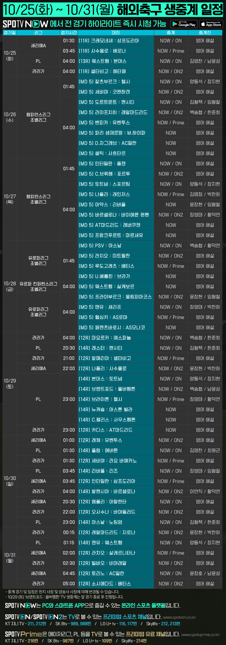 (KT 지니 TV 211번 / SK Btv 989번 / LG U+ tv 116번 / Skylife 212번)