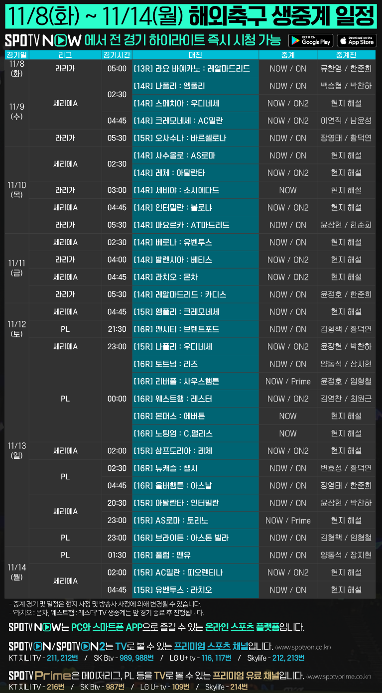 11/8(화) ~ 11/14(월) 해외축구 생중계 일정 안내2022-11-07