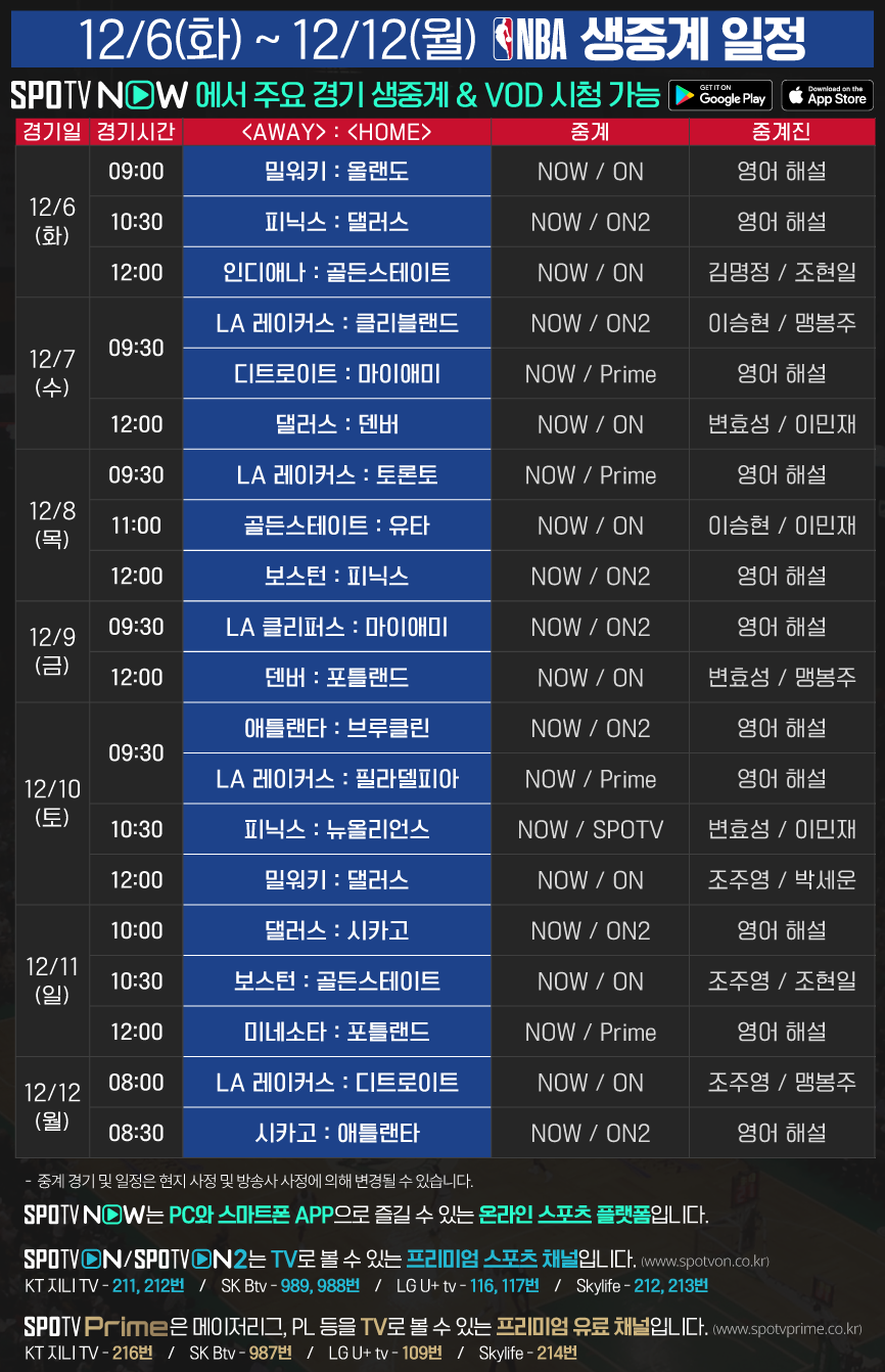 이번 시즌 역시 NBA 주요 경기 생중계는 SPOTV NOW, SPOTV ON에서 만나보세요!