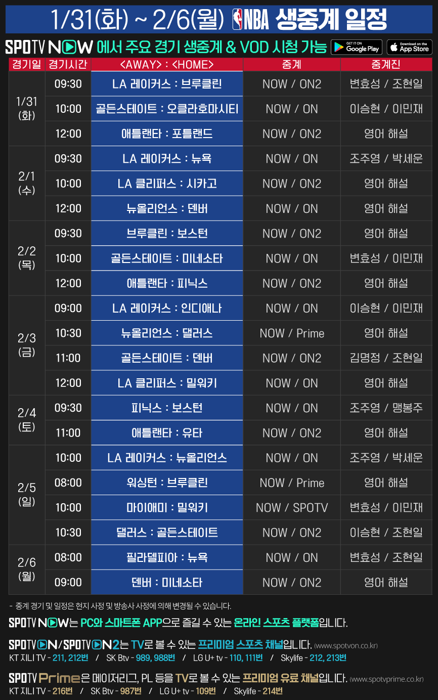 1/31(화) ~ 2/6(월) 22-23 NBA 중계 일정 안내2023-01-30