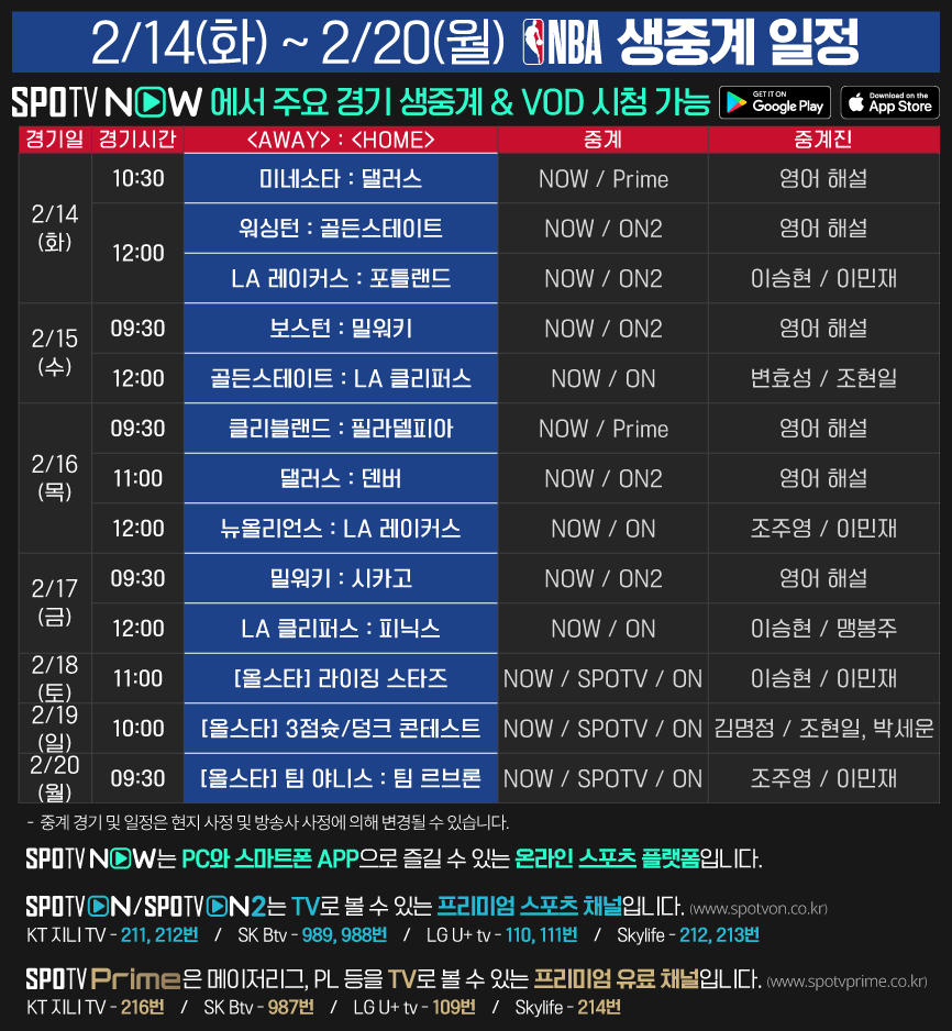 2/14(화) ~ 2/20(월) 22-23 NBA & NBA 올스타 중계 일정 안내2023-02-13