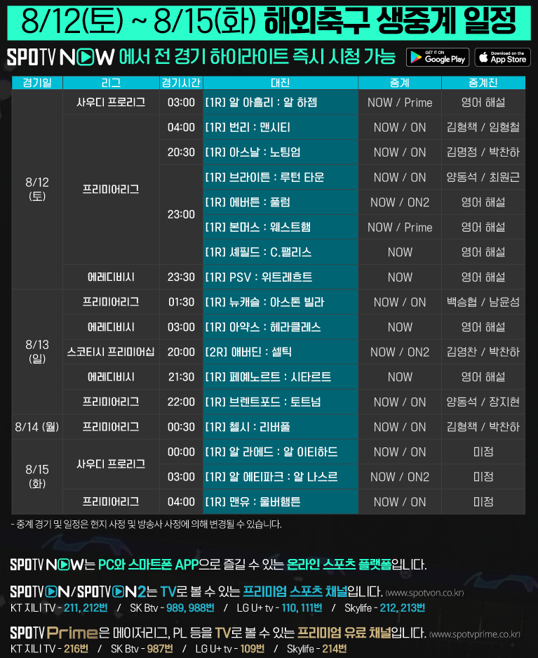 12일 토요일 개막하는 23-24 프리미어리그 전 경기부터 사우디 프로리그, 에레디비시 주요 경기를 SPOTV NOW에서 만나 보세요.