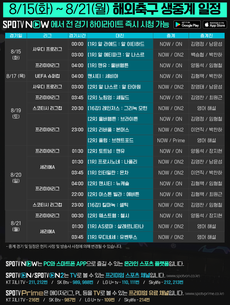 20일 일요일 개막하는 23-24 세리에A 주요 경기를 SPOTV NOW, SPOTV ON에서 만나 보세요.
