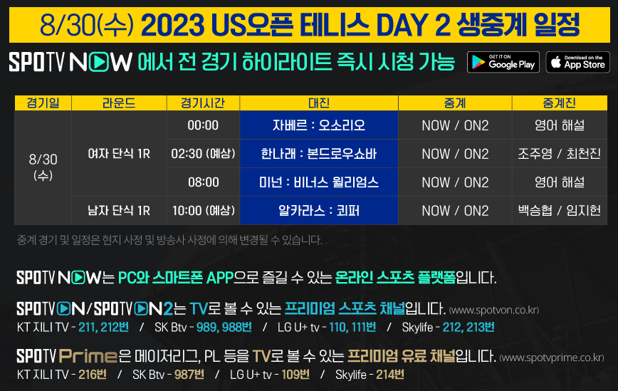 2023 US오픈 테니스 주요 경기 TV 생중계는 SPOTV ON2에서 만날 수 있습니다.
