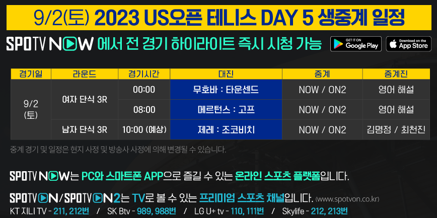 2023 US오픈 테니스 주요 경기 TV 생중계는 SPOTV ON2에서 만날 수 있습니다.