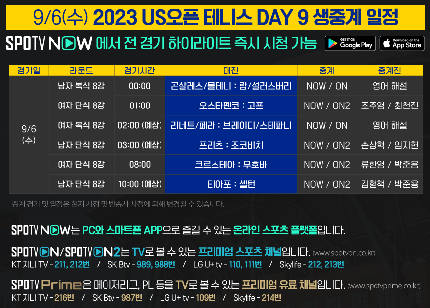 2023 US오픈 테니스 주요 경기 TV 생중계는 SPOTV ON, ON2에서 만날 수 있습니다.