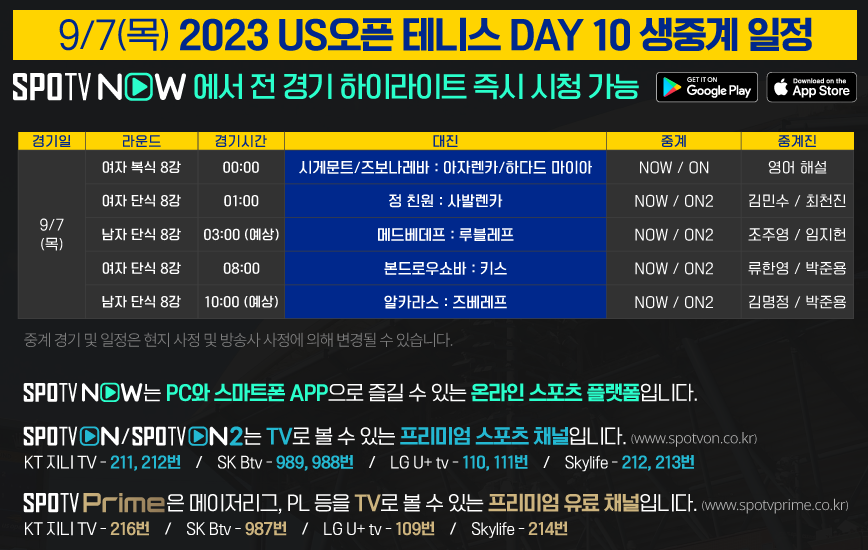 2023 US오픈 테니스 주요 경기 TV 생중계는 SPOTV ON, ON2에서 만날 수 있습니다.