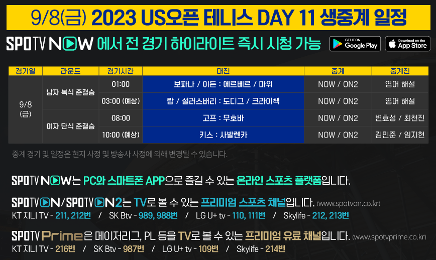 9/8(금) 2023 US오픈 테니스 Day 11 중계 및 이벤트 안내2023-09-07