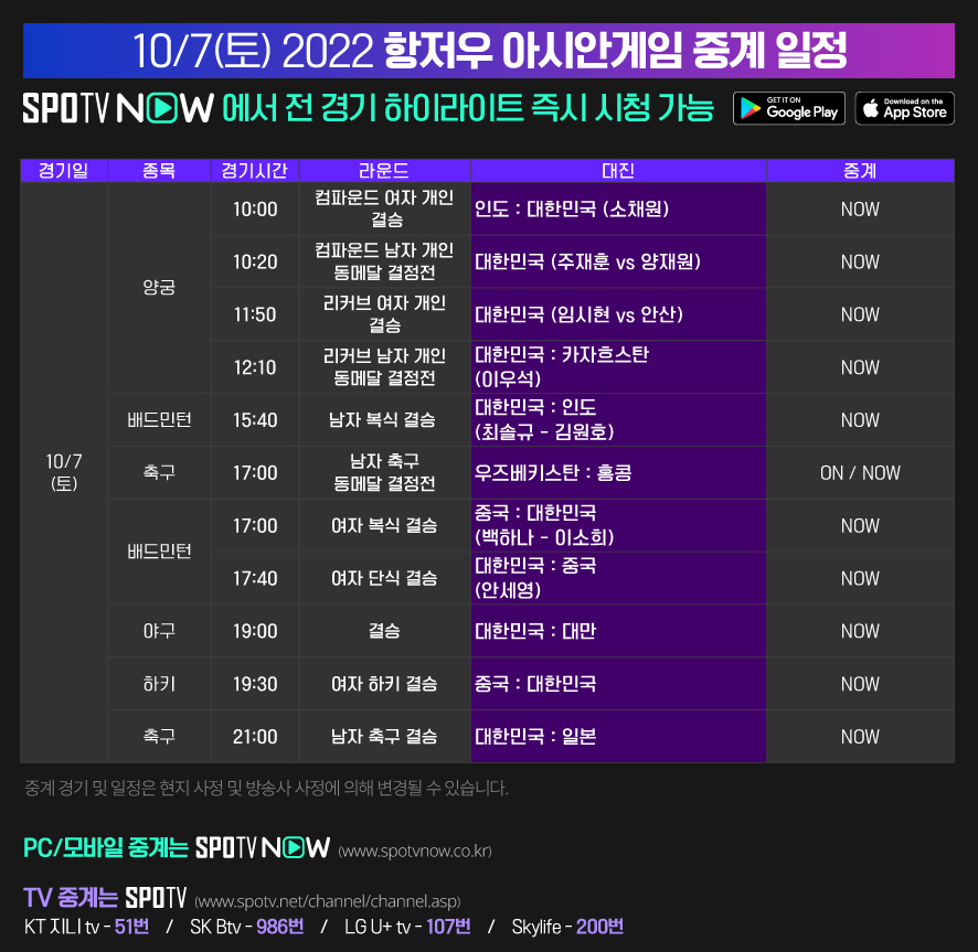 스포츠 전문 채널 SPOTV가 2022 항저우 아시안게임을 중계합니다.