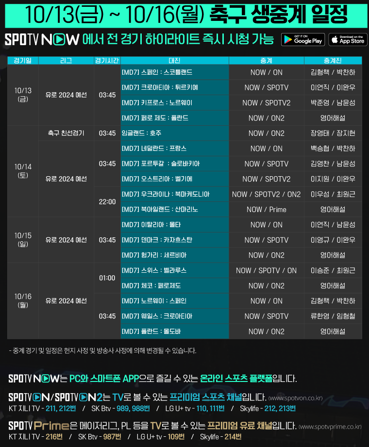 10/13(금) 03:45 스페인 : 스코틀랜드 / NOW, ON
