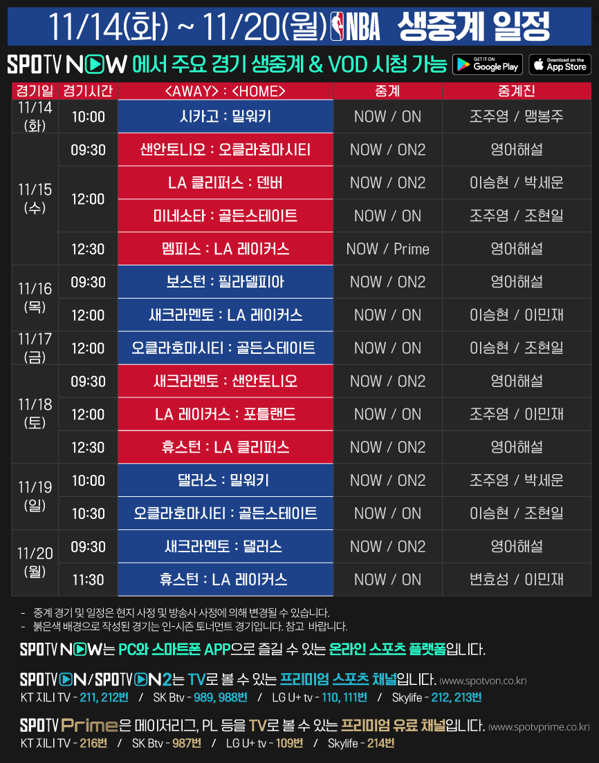 11/14(화) ~ 11/20(월) 23-24 NBA 생중계 일정 안내2023-11-13