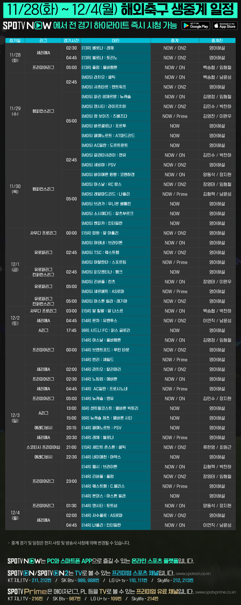 12/4(월) 01:30 맨시티 : 토트넘 / NOW, ON (손흥민)