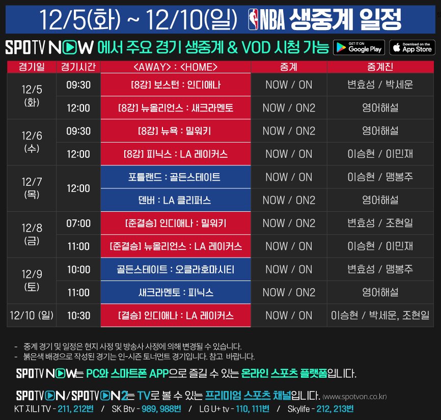 또한, 23-24 NBA 주요 경기 생중계 역시 SPOTV NOW, SPOTV ON에서 시청하실 수 있습니다.