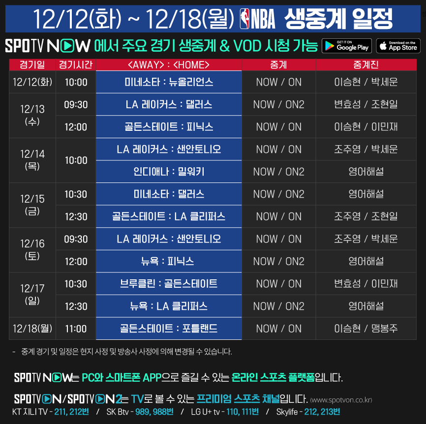 12/12(화) ~ 12/18(월) 23-24 NBA 생중계 일정 안내2023-12-11