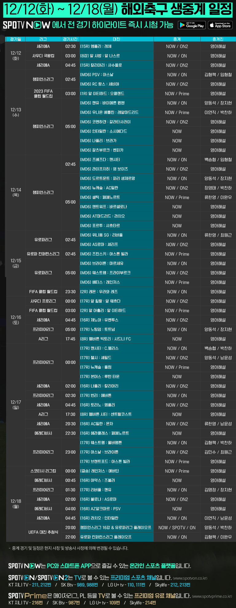 12/13(수) 05:00 맨유 : 바이에른 뮌헨 / NOW, ON (김민재)