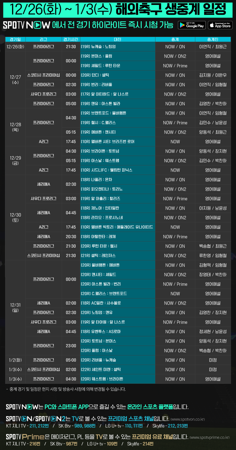12/29(금) 04:30 브라이튼 : 토트넘 / NOW, ON
