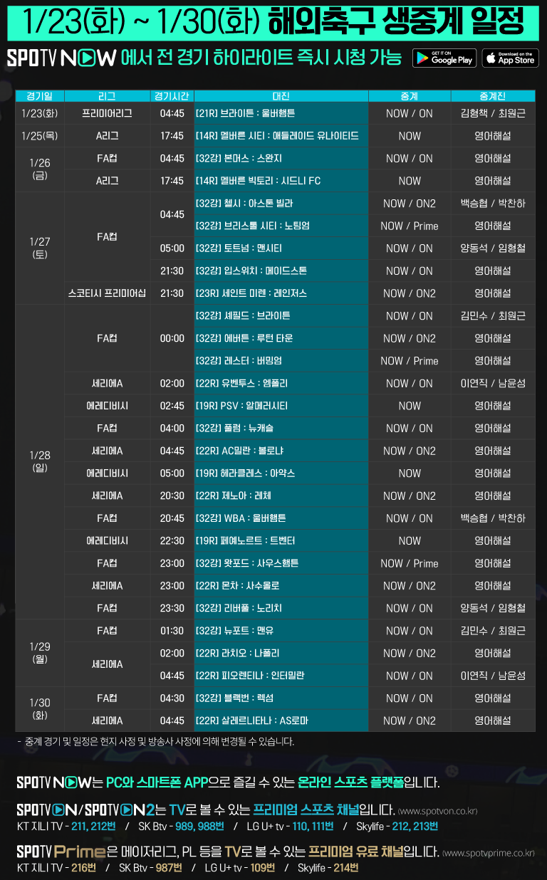 1/23(화) 04:45 브라이튼 : 울버햄튼 / NOW, ON