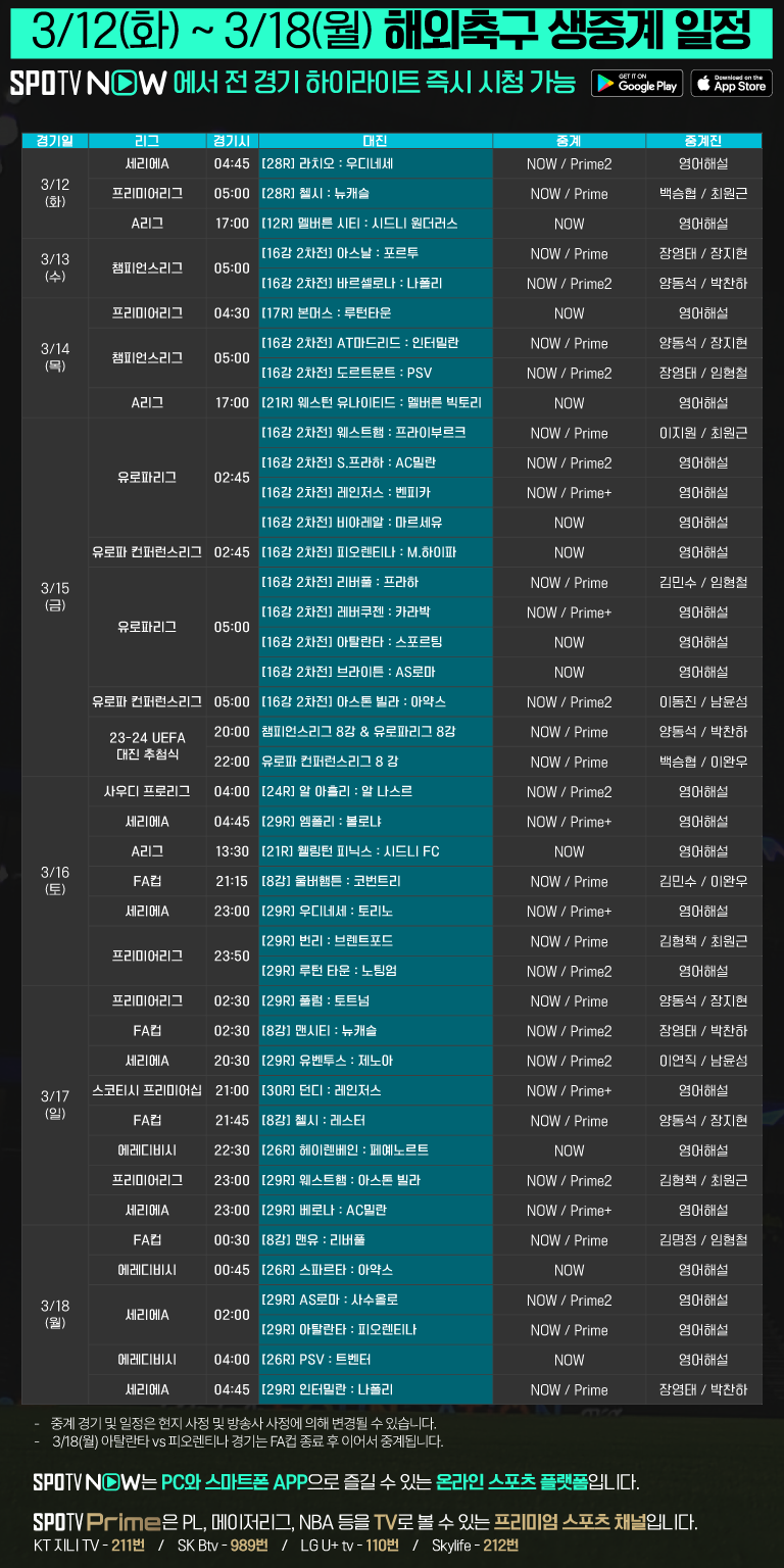 22:00 유로파 컨퍼런스리그 8강 / NOW, Prime