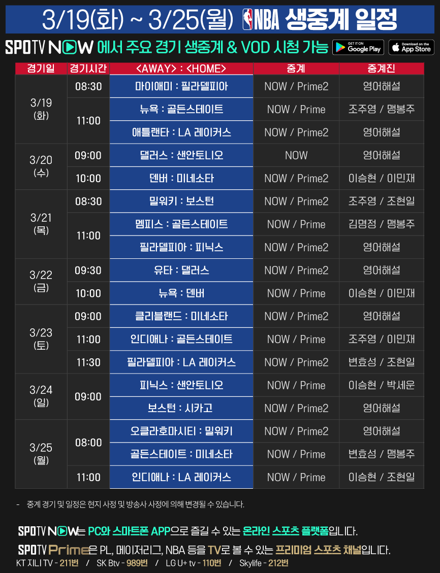3/19(화) ~ 3/25(월) 23-24 NBA 생중계 안내2024-03-18