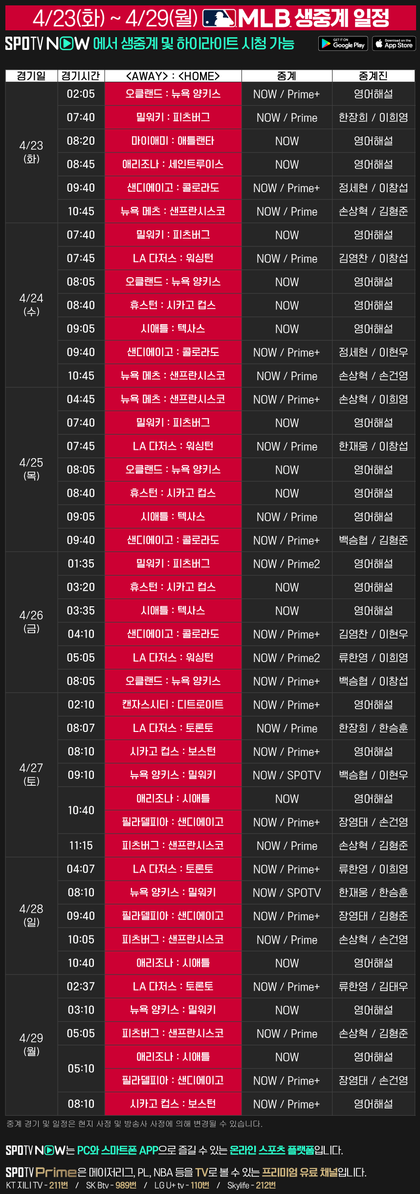 4/23(화) ~ 4/29(월) 2024 메이저리그 생중계 안내 (이정후 중계 포함)2024-04-22